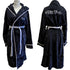 Material: Black super soft fleece hooded robe with contrasting red piping & belt.