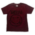 An official licensed Nirvana Kids T-Shirt featuring the 'Grey Happy Face' design motif. This high quality T-Shirt is available in a maroon red colourway.