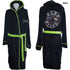 Material: Black super soft fleece hooded robe with contrasting red piping & belt.